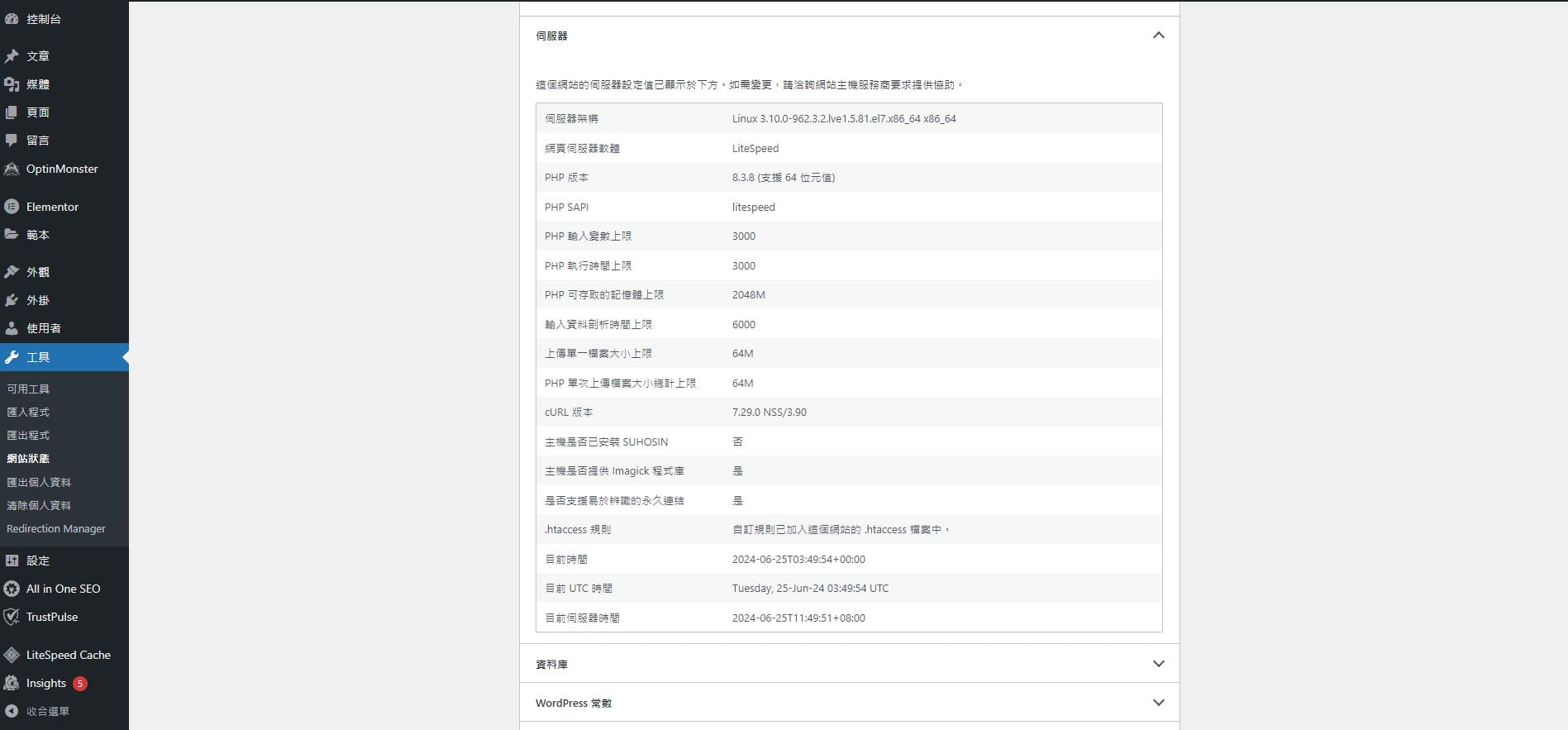 首先,通過 工具 → 網站狀態 → 網站狀態分頁 頁面上的伺服器標籤檢查當前的伺服器限制。雖然 WordPress 通常將記憶體限制設置為 32 MB,最大執行時間設置為 30 秒,但您的網路虛擬主機可能會分配比默認值更高的最大值。