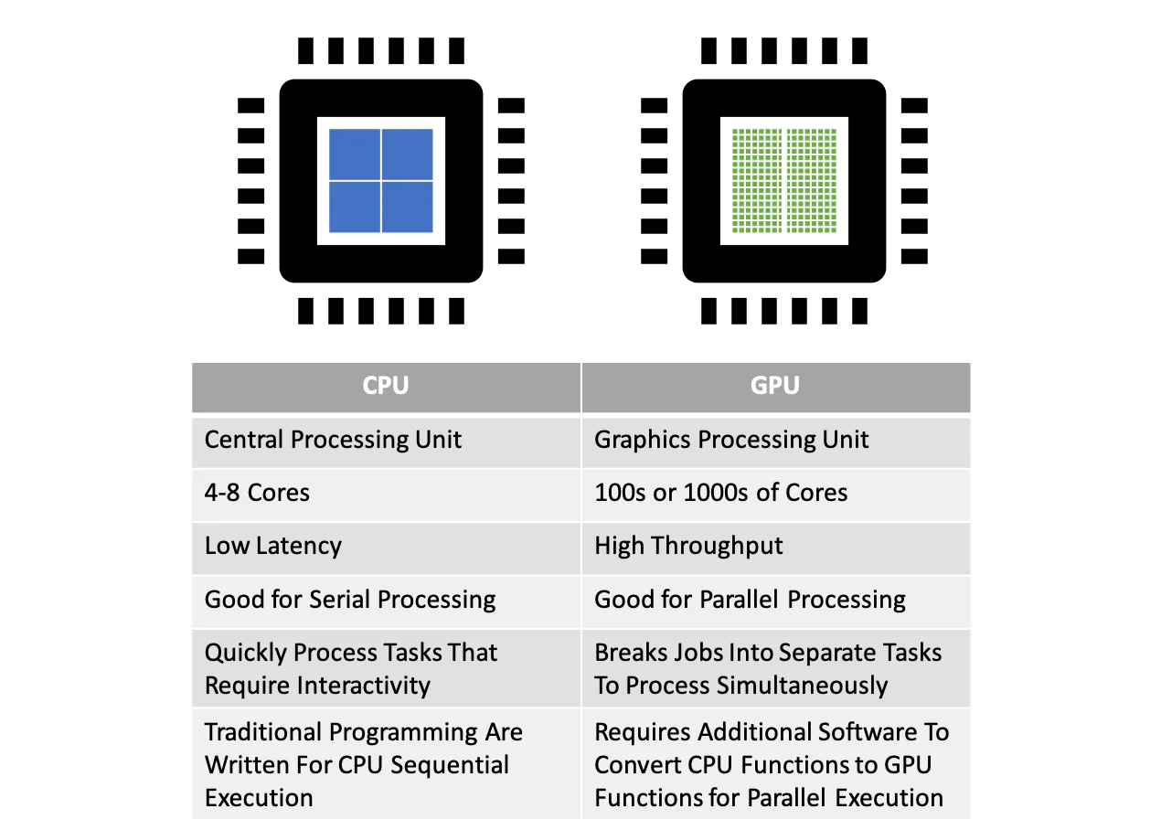 傳統 CPU 設計目標是處理少量、複雜且高度分支的指令流程,而 GPU 則天生就是為了「同時處理成千上萬筆數學運算」而設計。